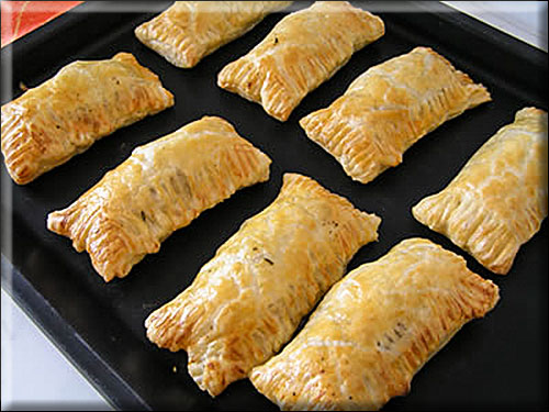 Blätterteigscheiben halbieren. Alle Zutaten für die Füllung mischen. Auf je eine Scheibenhälfte 1 EL Füllung geben, die Ränder mit Eiweiß bestreichen und die andere Hälfte darüber klappen. Teigränder mit Hilfe einer Gabel fest zusammendrücken und die Taschen mit Eigelb bestreichen.