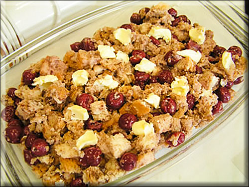 Brot in Scheiben schneiden, Salz, Zucker, Zimt und Eier mit der Milch verquirlen, über das Brot geben und gut durchziehen lassen. Obst oder Früchte mit der Masse gut vermischen und in die gefettete Auflaufform geben. Dann mit Butterflöckchen belegen und backen.